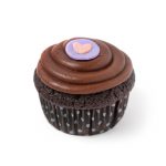 Swirled blend of chocolate and vanilla cake topped with creamy chocolate and vanilla buttercream and a marble chocolate stick.