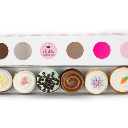Our signature Dots cupcakes baked from scratch using only the best ingredients-pure Madagascar Vanilla, Valrhona Chocolate, juicy fruit purees, farm fresh eggs and sweet cream butter. Made with love every day by our Dots bakers.